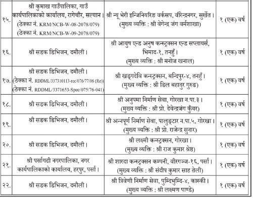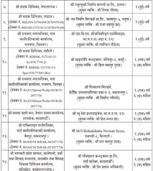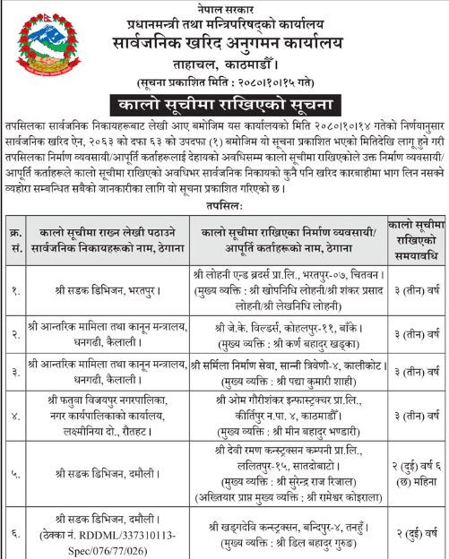कालो सूचीमा पर्नेमध्ये अधिकांश निर्माण कम्पनीहरु छन्। उनीहरुले सडक निर्माण तथा विभिन्न सरकारी ठेक्काहरु अलपत्र पारेको पाइएपछि कालो सूचीमा राखिएको प्रधानमन्त्री तथा मन्त्रिपरिषद् कार्यालय मातहतको सार्वजनिक खरिद अनुगमन कार्यालयले जानकारी दिएको छ।