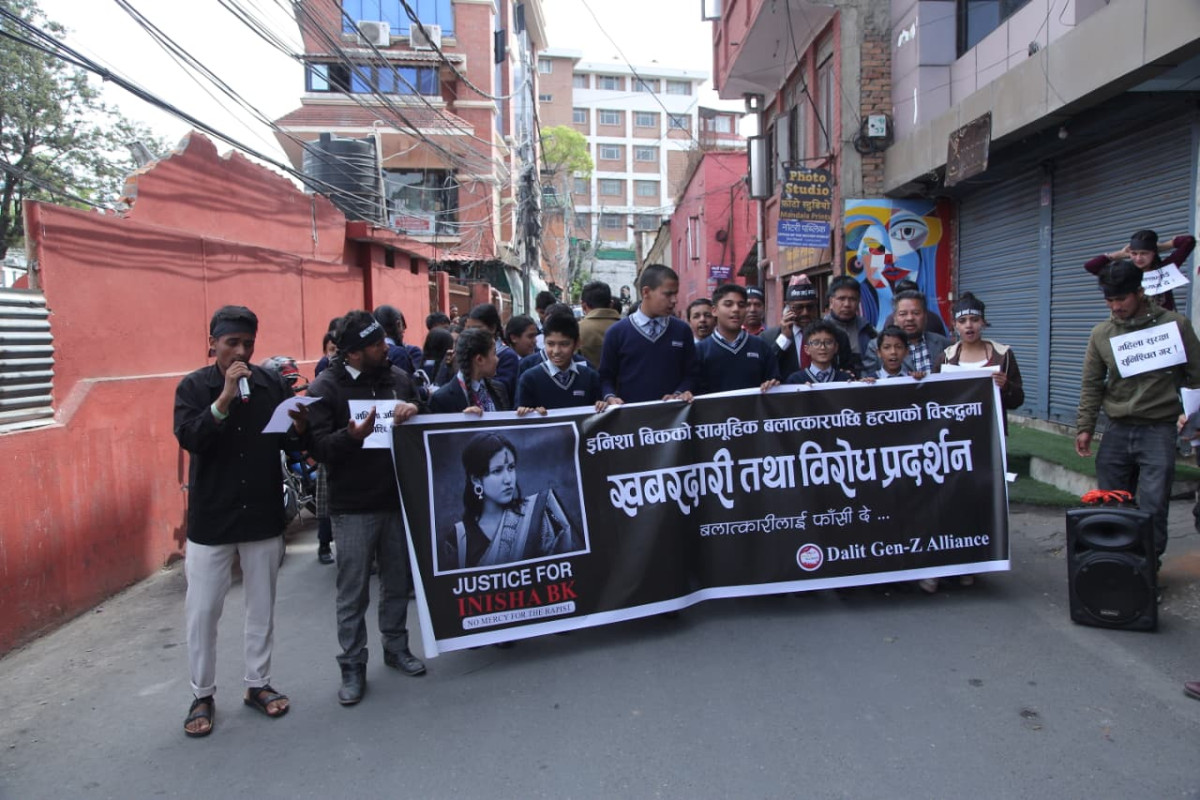 घटनाको सत्यतथ्य छानबिन गरी दोषीलाई कडा कारबाहीको माग गर्दै युवा, विद्यार्थी, अधिकारकर्मी तथा सर्वसाधारणले प्लेकार्डसहित प्रदर्शन गरेका हुन् । प्रदर्शनकारीहरूले ‘इनिशा विकलाई न्याय दे’, ‘दोषीलाई उम्काउन पाइँदैन’, ‘महिला हिंसा अन्त्य गर’ जस्ता नारा लेखिएका प्लेकार्ड बोकेका थिए ।